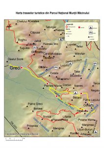 Ruta: Greci – Pașunea Crucele – Valea Cozluk – Valea Radului – Teiul Strâmb – Baia de aramă – Pietrele Lacului – Vf. Conaciu – Valea Plopilor – Pietrele Mariei – Greci